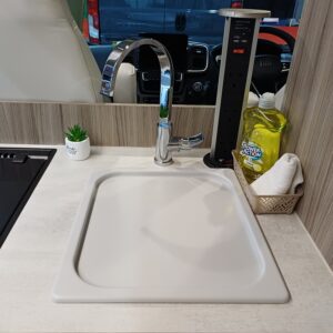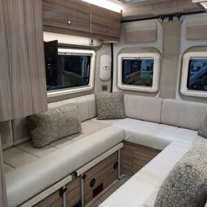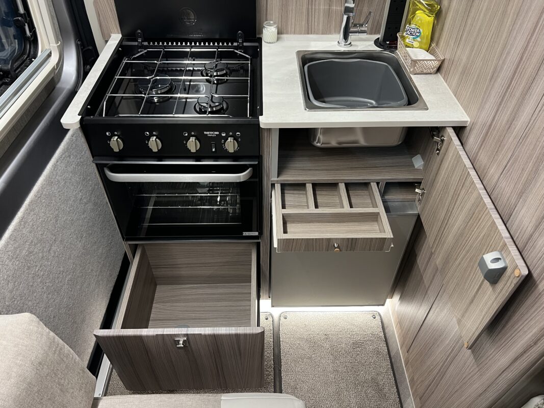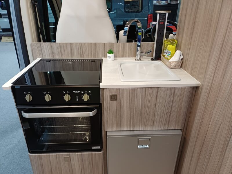 The full oven/grill, three burner hob and low energy fridge freezer are perfect for a motorhome of this size. There is also a handy storage cupboard for cutlery and crockery. Worktops are finished in a durable scratch-resistant laminate. (induction hob available)