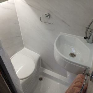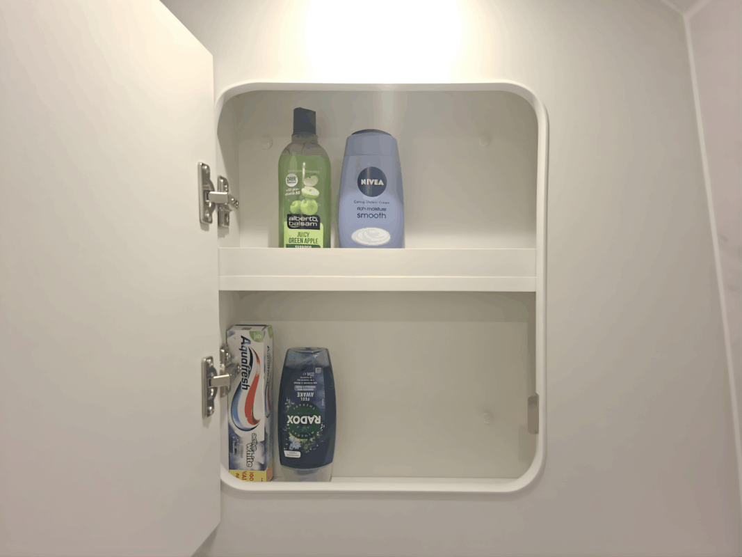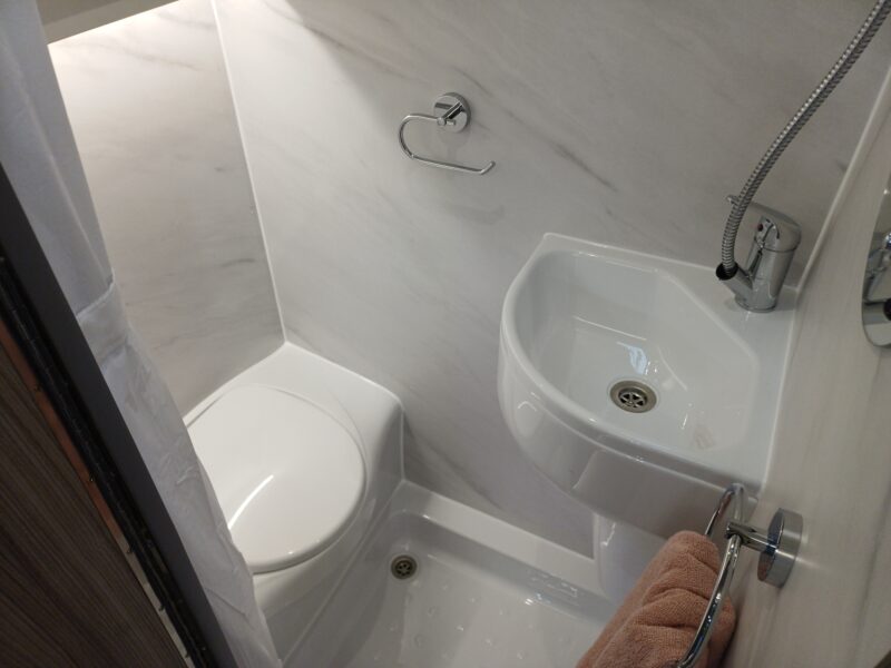 The washroom incorporates a shower, toilet, large sink and spacious bathroom cabinet which gives you everything you need for off-grid camping.