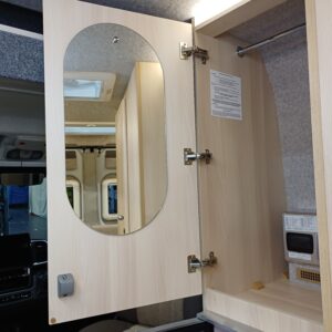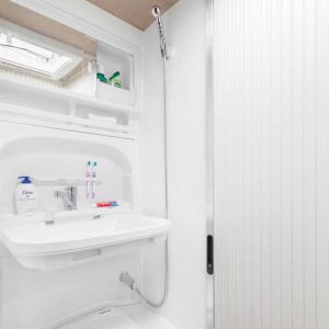 The washroom incorporates a shower, toilet, drop down sink and spacious bathroom cabinet which gives you everything you need for off-grid camping.