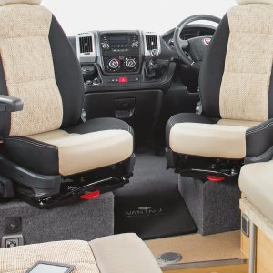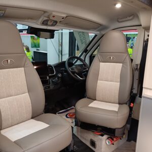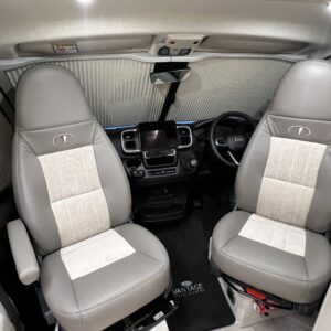 Throughout the vehicle we fit Remis blinds including the cab. Visually impressive with its surrounding frame and pleated material to help you get a better nights sleep. This prevents others from looking in and protects the cab from sunlight. The front Cab seats swivel to create a comfortable dinette.