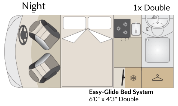 While only 5.41m long, you’ll be amazed at how spacious and ‘car-like’ this van conversion feels. It is the smallest of our front lounge layouts, but the GEM still has the luxury feel and appearance of a much larger motorhome. Both seats in the cab area fully swivel to create a comfortable sitting area adjacent to the lounge and sliding door.