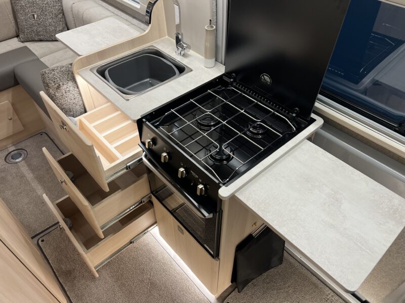 The kitchen has a large low-energy fridge freezer, a 3-burner hob, and an oven with grill. Side flip-up extensions create additional worktop space on either side, while built-in cutlery drawers and deep storage drawers provide ample room for utensils, cookware, and provisions, making the kitchen both practical and easy to use on the road.