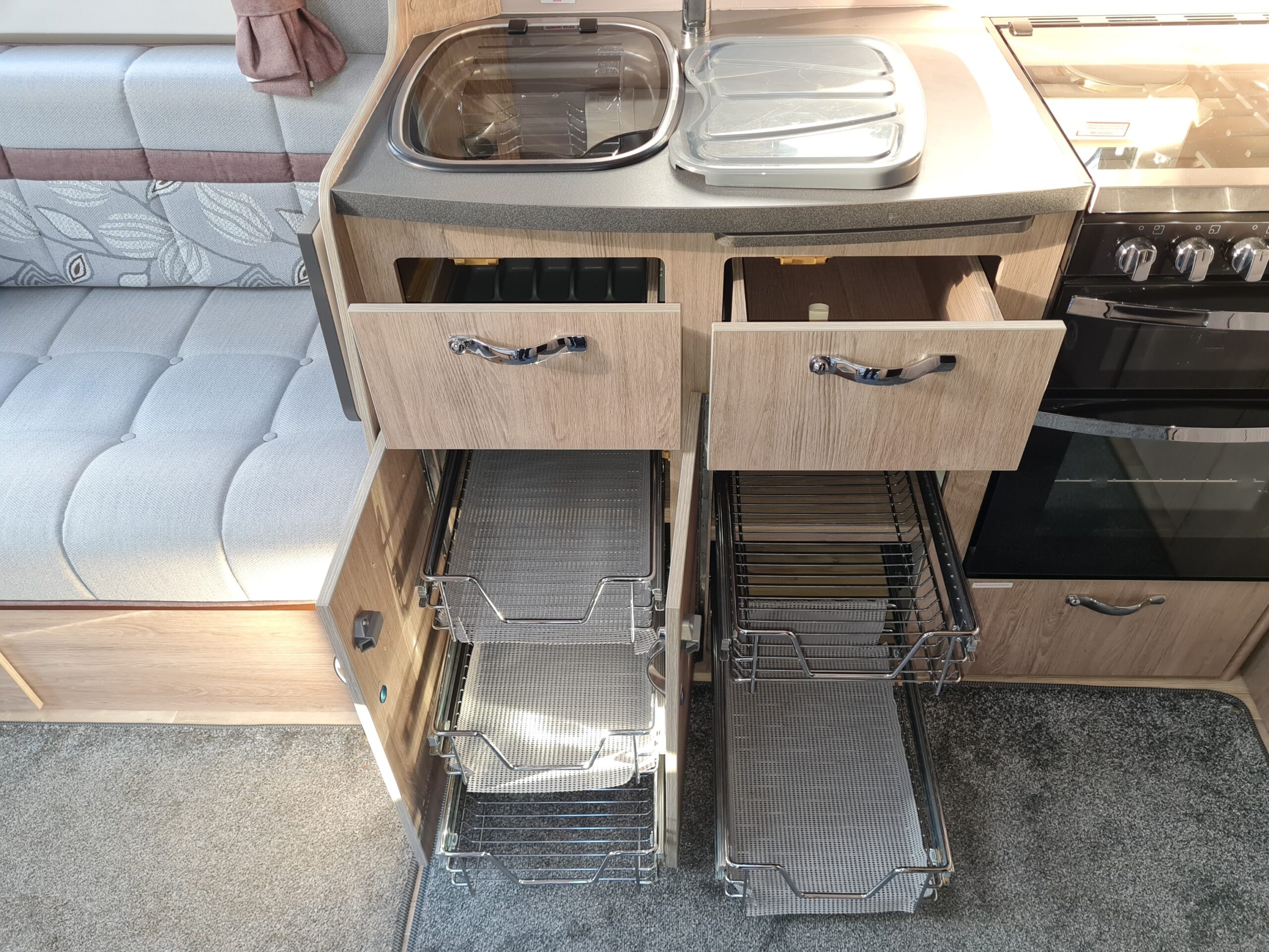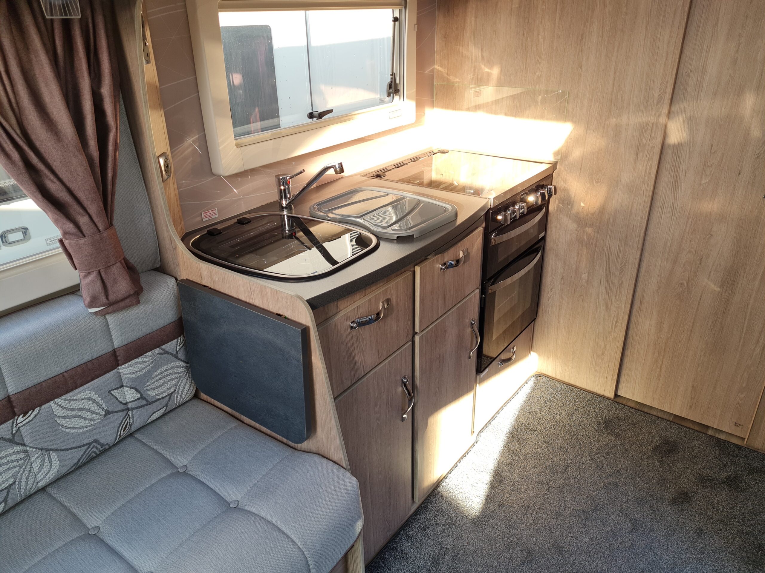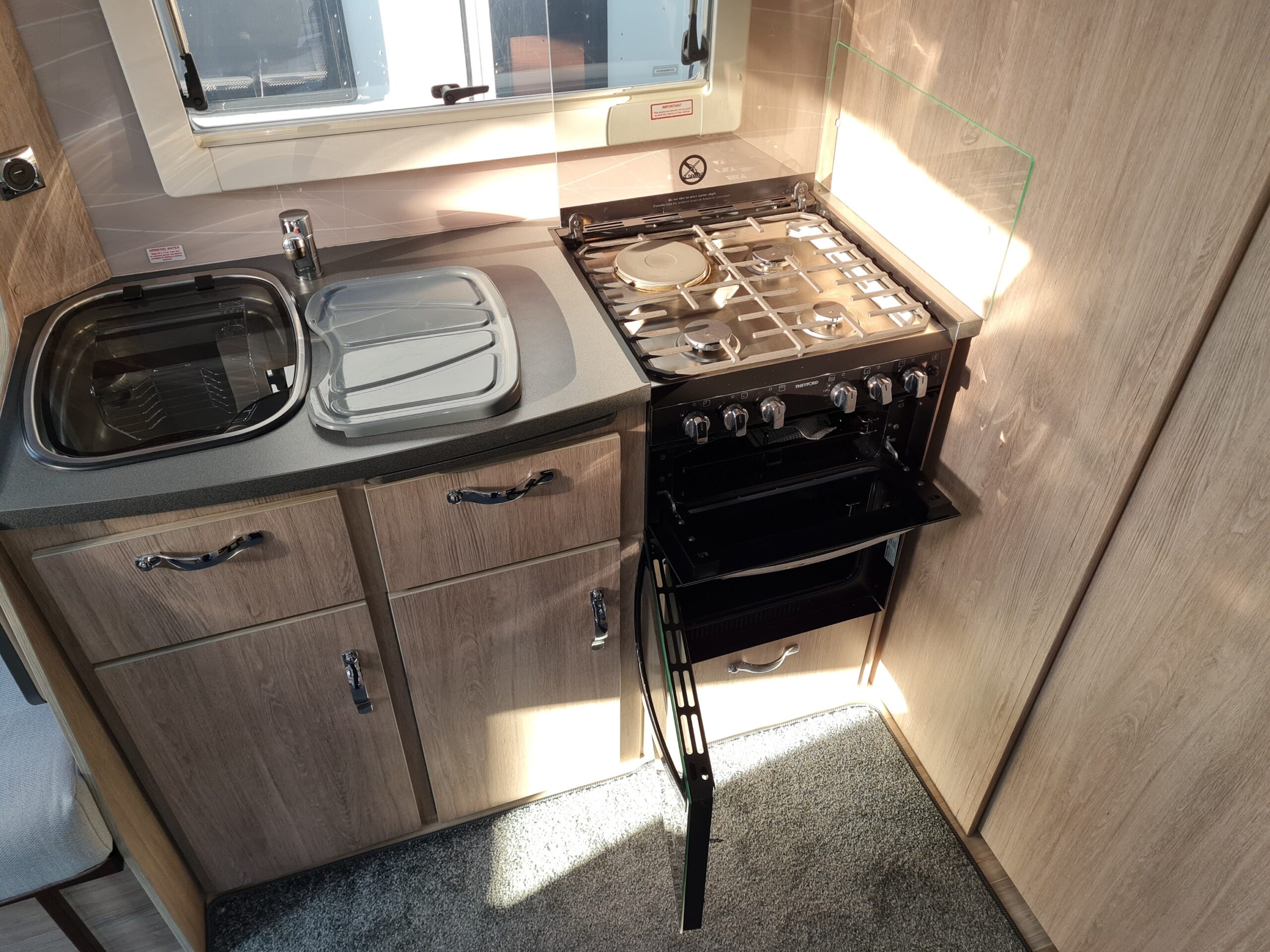 - Thetford 3 burner gas hob, electric hotplate and separate gas oven and grill
