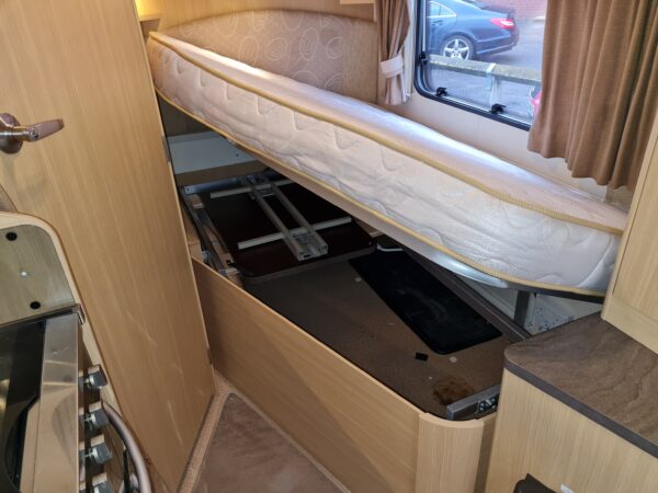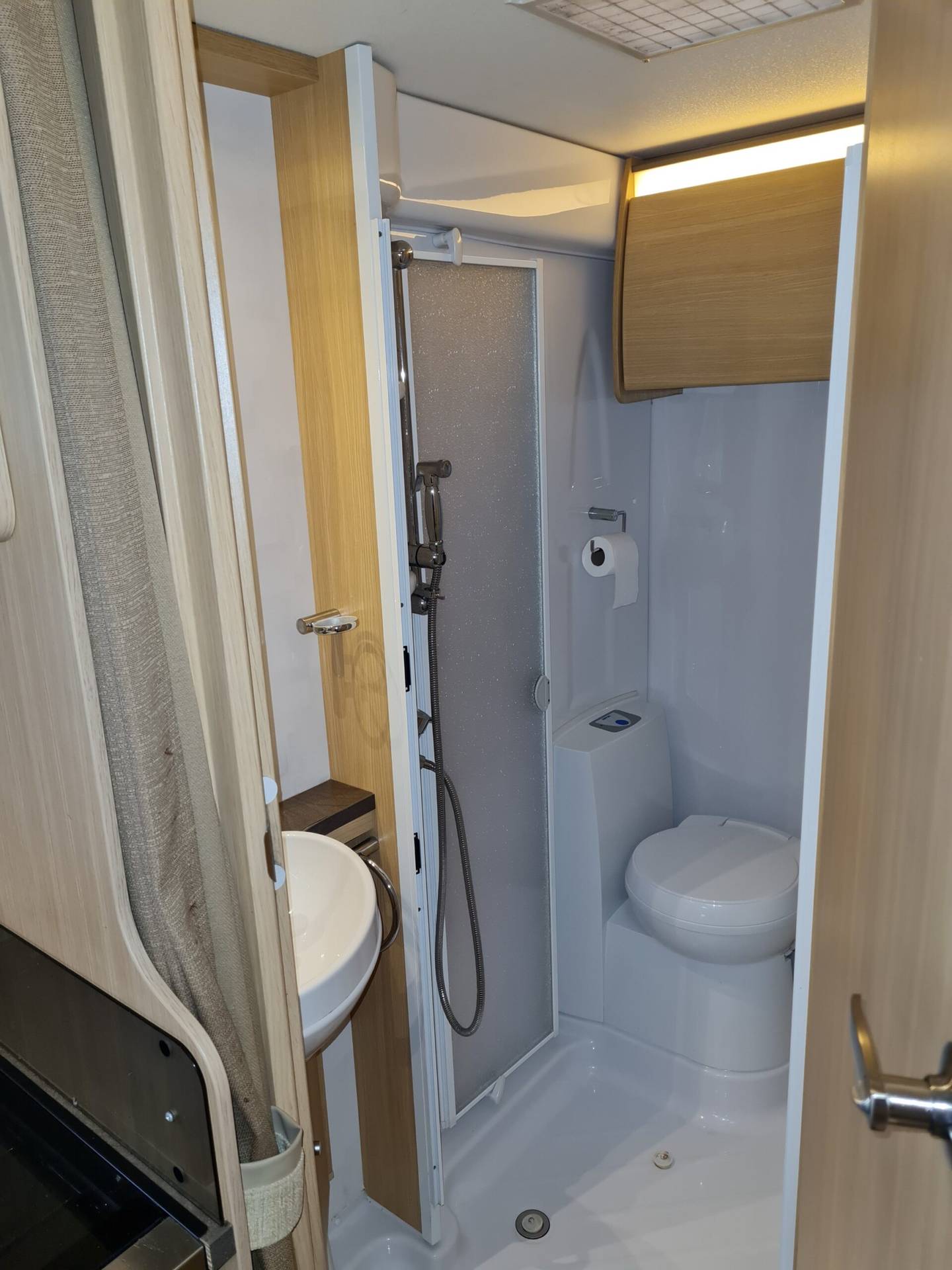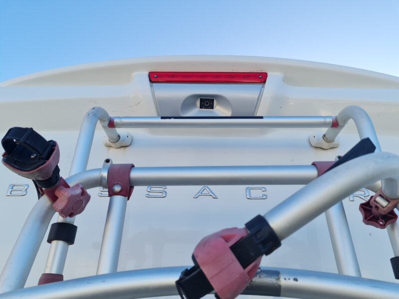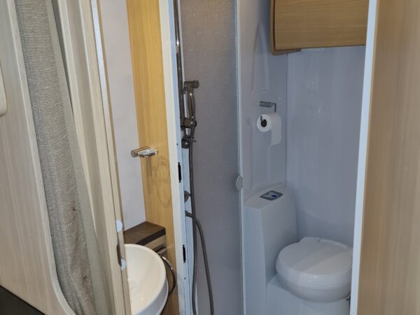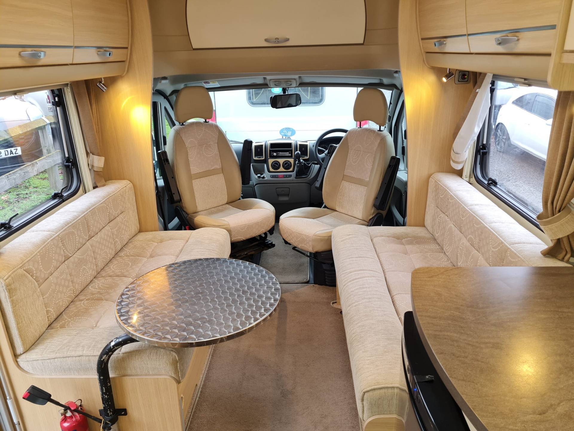 The front lounge can be used as a double bed, and there is a french bed double bed on the rear nearside of the van. There is a freestanding table to use for dining or entertaining, and the kitchen is well equipped with gas and electric hobs, oven and grill, microwave and a large Thetford 3 way fridge freezer. The bathroom is located at the rear offside of the motorhome adjacent to the bedroom and has a pedestal toilet and shower separate from the hand wash basin. This is a 3500kg motorhome so any one can only drive it with a full manual driving license.