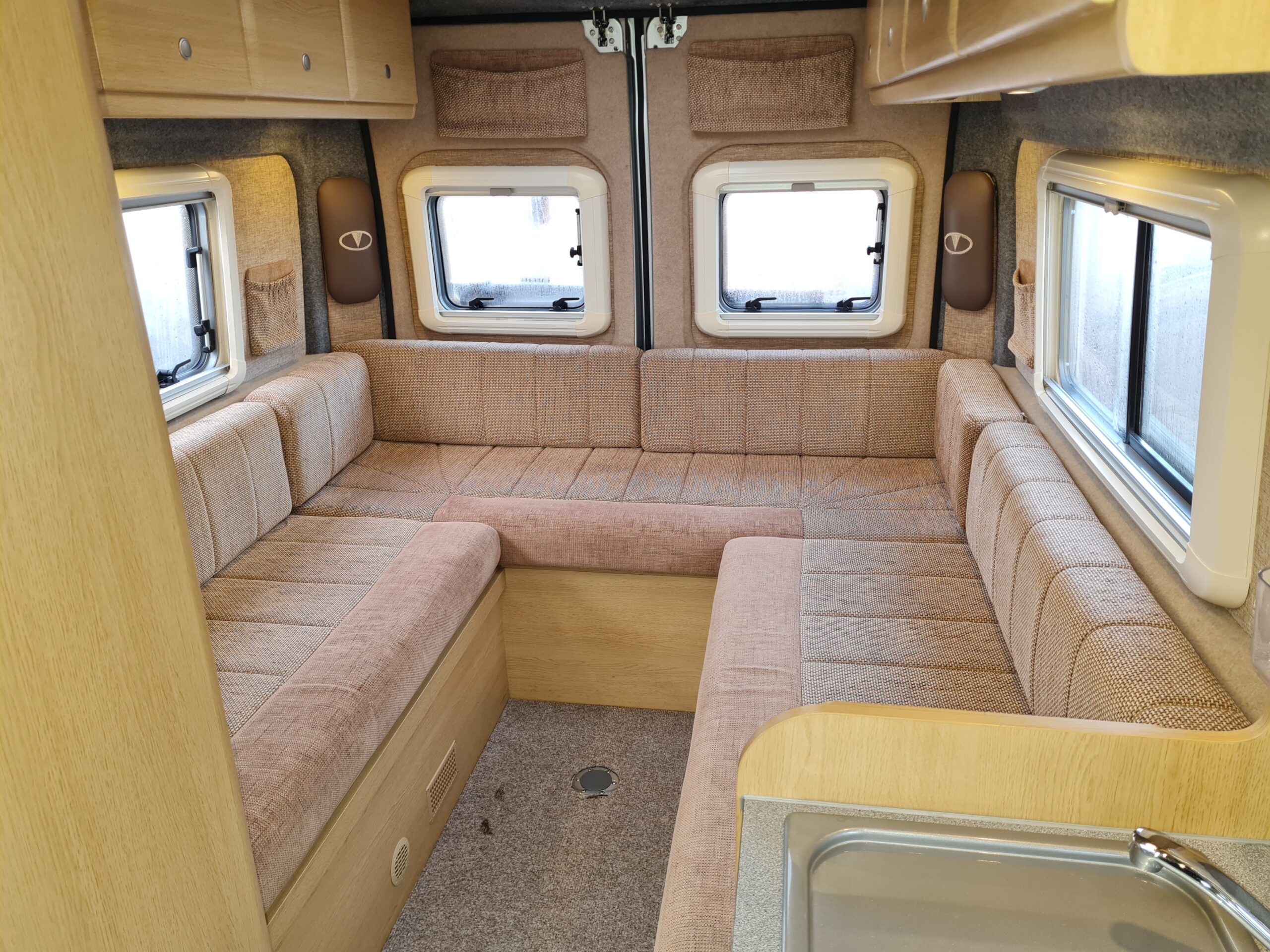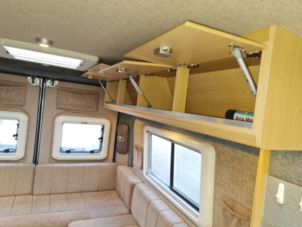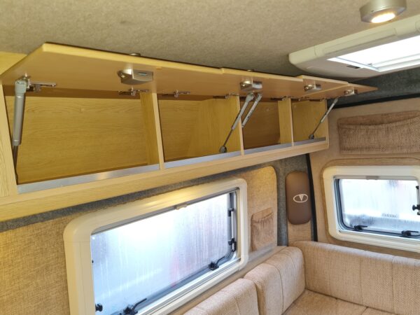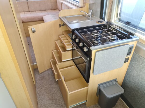 This lovely two berth motorhome has a rear u-shaped lounge that quickly converts in to a super king size bed with ample storage spaces below the rear seating and in the top lockers above. The kitchen area is well equipped with a combined gas oven and grill, triple burner gas hob, Vitrifrigo 12v compressor fridge / freezer. The front seats swivel to create a cosy dinette feature next to the sliding door and the bathroom that is located adjacent to the kitchen area is equipped with a bench style toilet, hand wash basin and shower. This lovely motorhome is just under 6m in length and at 3500kg is driveable by anyone with a full driving license.