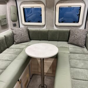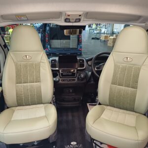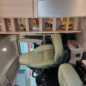 Throughout the vehicle we fit Remis blinds including the cab. Visually impressive with its surrounding frame and pleated material to help you get a better nights sleep. This prevents others from looking in and protects the cab from sunlight. The front cab seats swivel creating a cosy dinette adjacent to the sliding door.