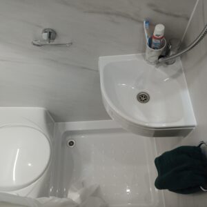 The washroom incorporates a shower, toilet, large sink and spacious bathroom cabinet which gives you everything you need for off-grid camping.