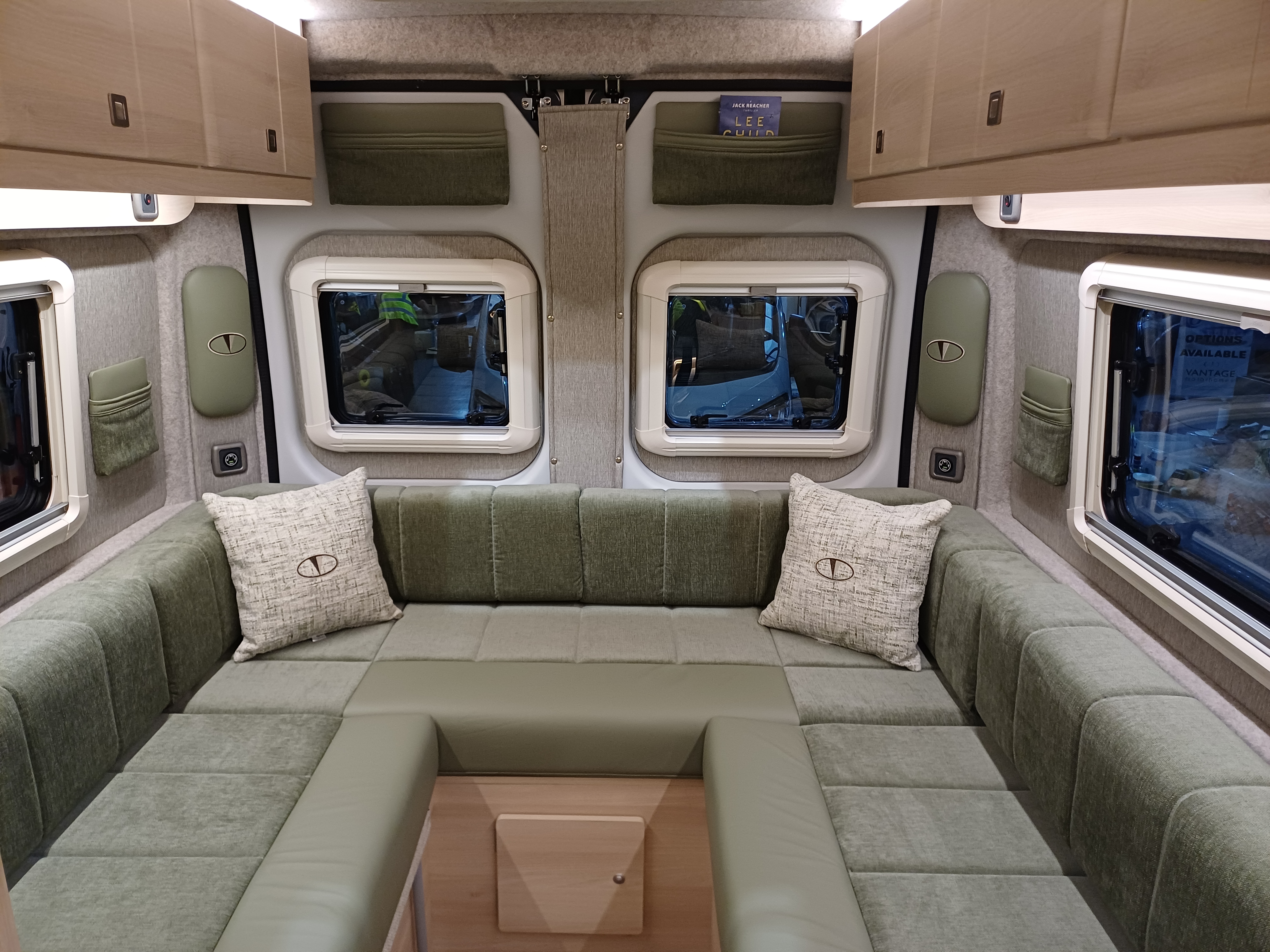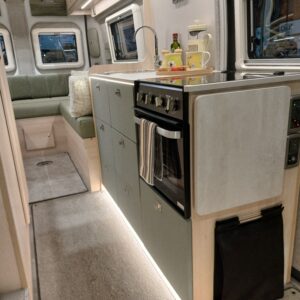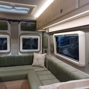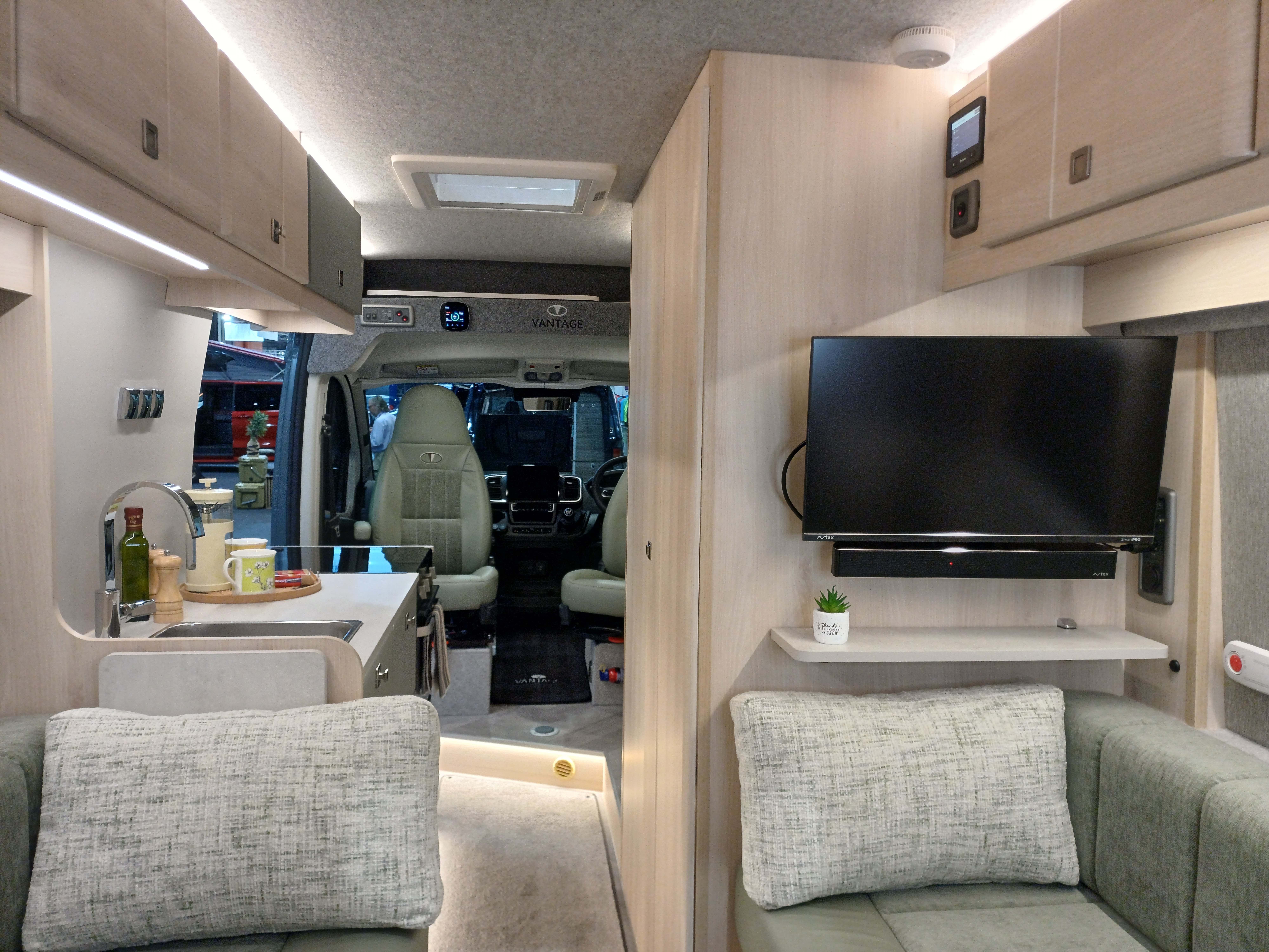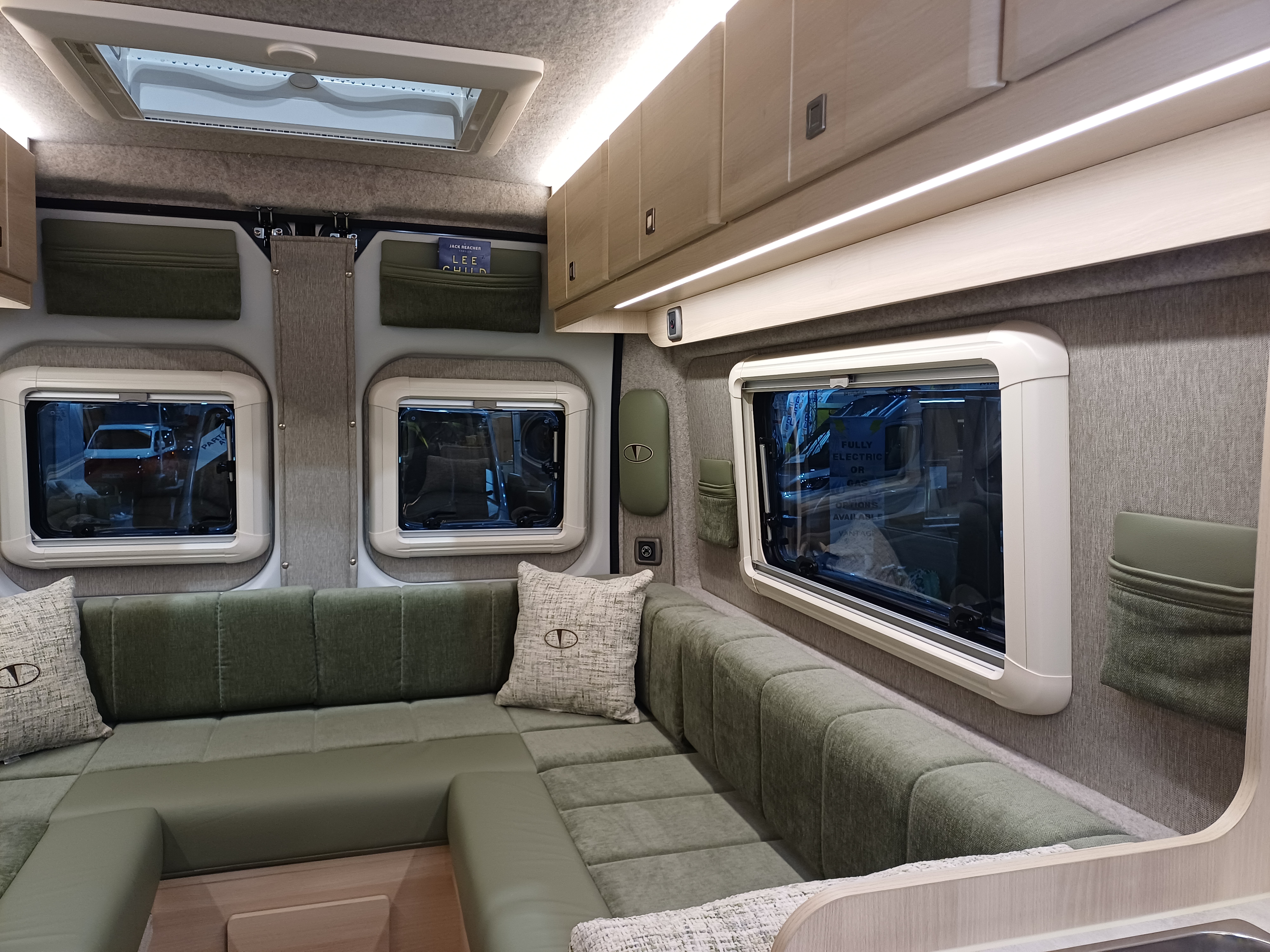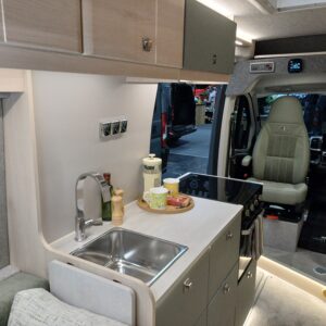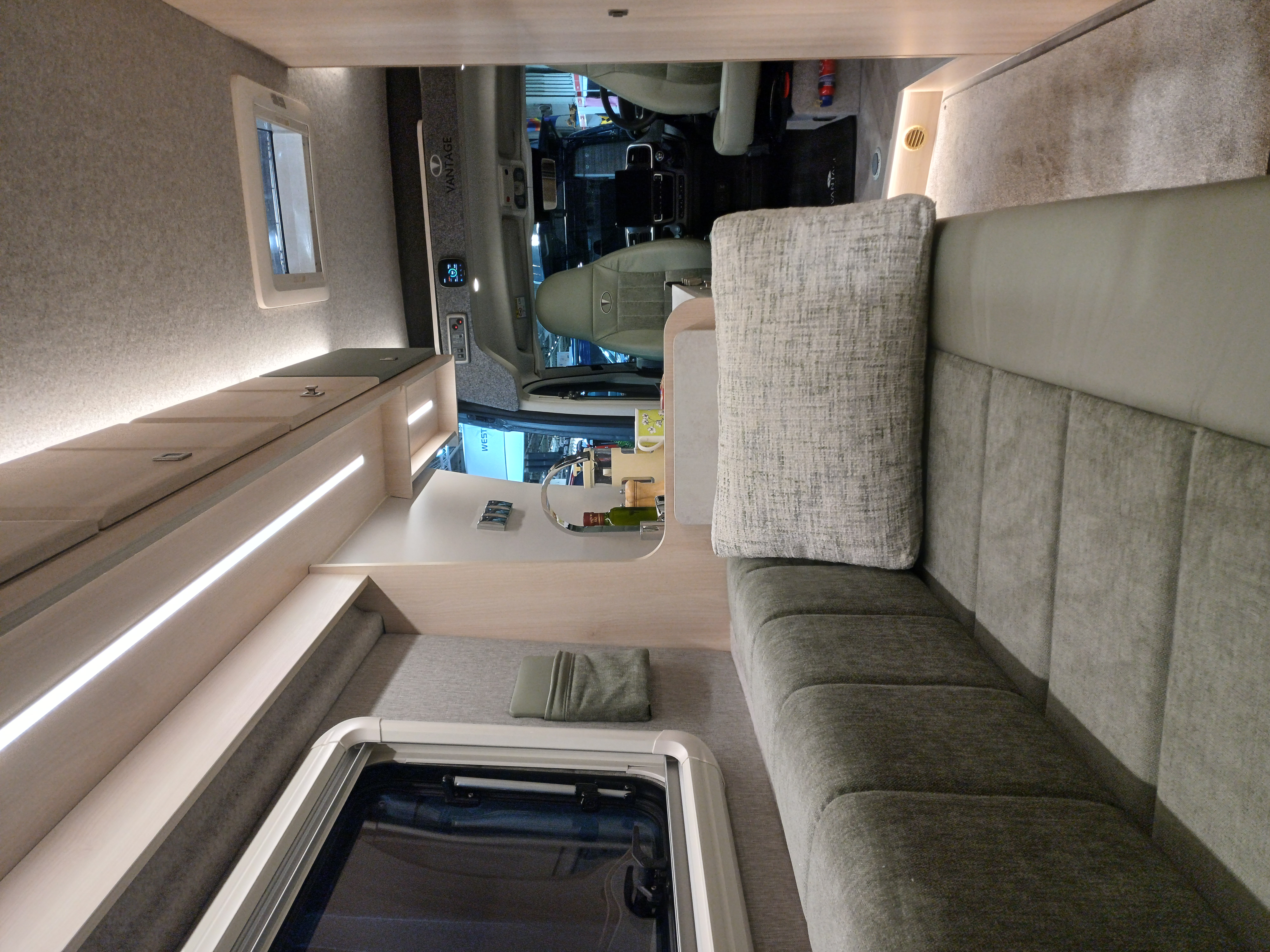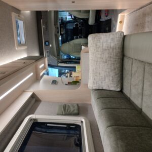 Throughout the vehicle is LED strip lights to create a cosy ambiance. The upper internal lockers provide great extra storage.