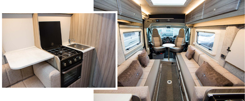 With a spacious front lounge, open-plan layout, and two large feet-up sofas, the ORA feels bright and airy. A versatile kitchen with full oven, fridge freezer, and fold-down work surface, plus flexible dining tables, makes it perfect for relaxing and entertaining on the road.
