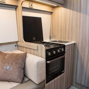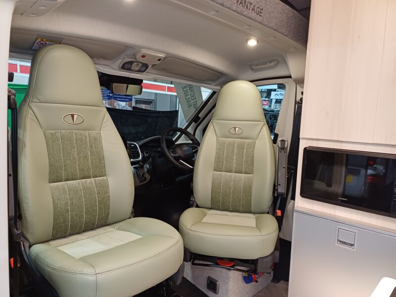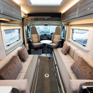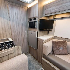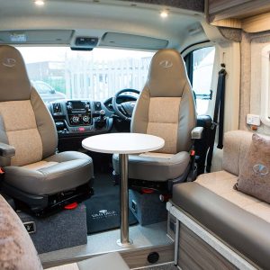 Throughout the vehicle we fit Remis blinds including the cab. Visually impressive with its surrounding frame and pleated material to help you get a better nights sleep. This prevents others from looking in and protects the cab from sunlight. The front cab seats swivel creating a cosy dinette adjacent to the sliding door.