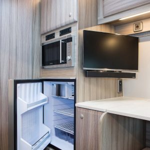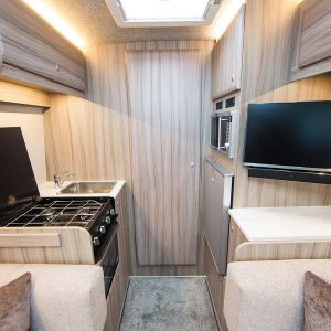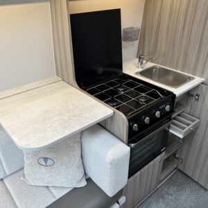 The well appointed kitchen is extremely versatile with a full oven and grill, a fold-down work surface, a fridge freezer and more, allowing you to enjoy the comforts of home while on the road.
