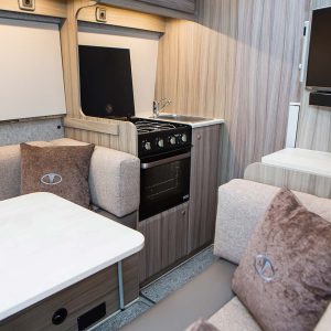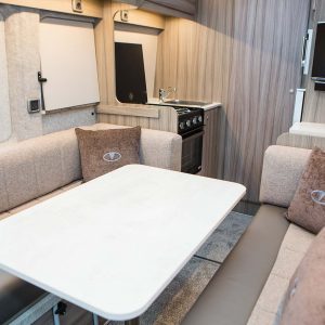 The swivelling cab seats and central table easily transform the area into a sociable dining space, while the clean lines, soft upholstery, and warm overhead lighting create a calm, premium atmosphere. It’s a space that feels just as comfortable for quiet evenings as it does for entertaining on the road.