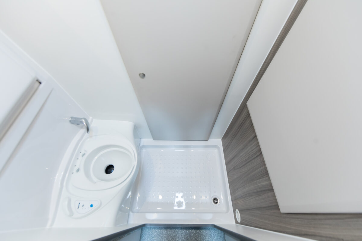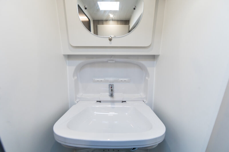 The large rear washroom is fully equipped with dropdown basin, mixer shower and a handy bathroom cabinet.